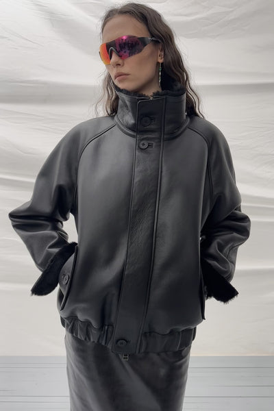 Arden shearling jacket by Kulakovsky crafted from black merino shearling – defined by a soft shoulder line shaped by a raglan sleeve. The smooth transition at the shoulder supports the relaxed cut and ensures a comfortable fit.