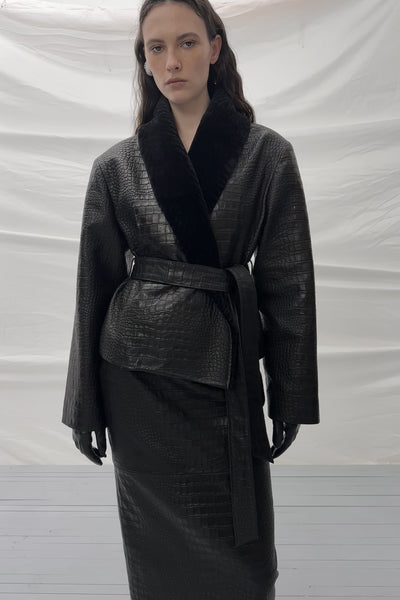 Lumen jacket by Kulakovsky crafted from croc-embossed leather – an oversized model with a textured astrakhan shearling collar and a full lining. The collar can be unbuttoned and folded back, functioning as a shawl. A detachable belt allows you to adjust the silhouette.